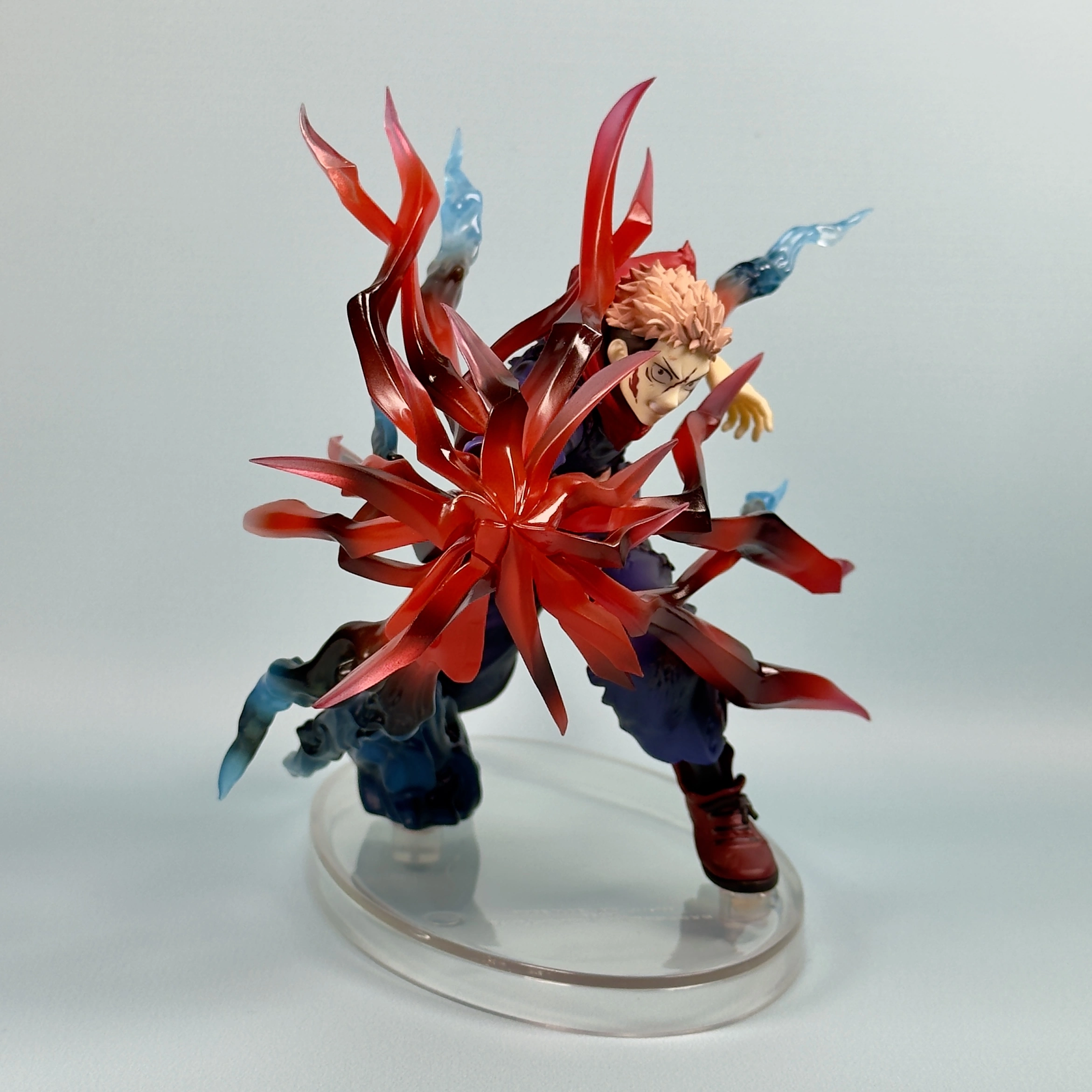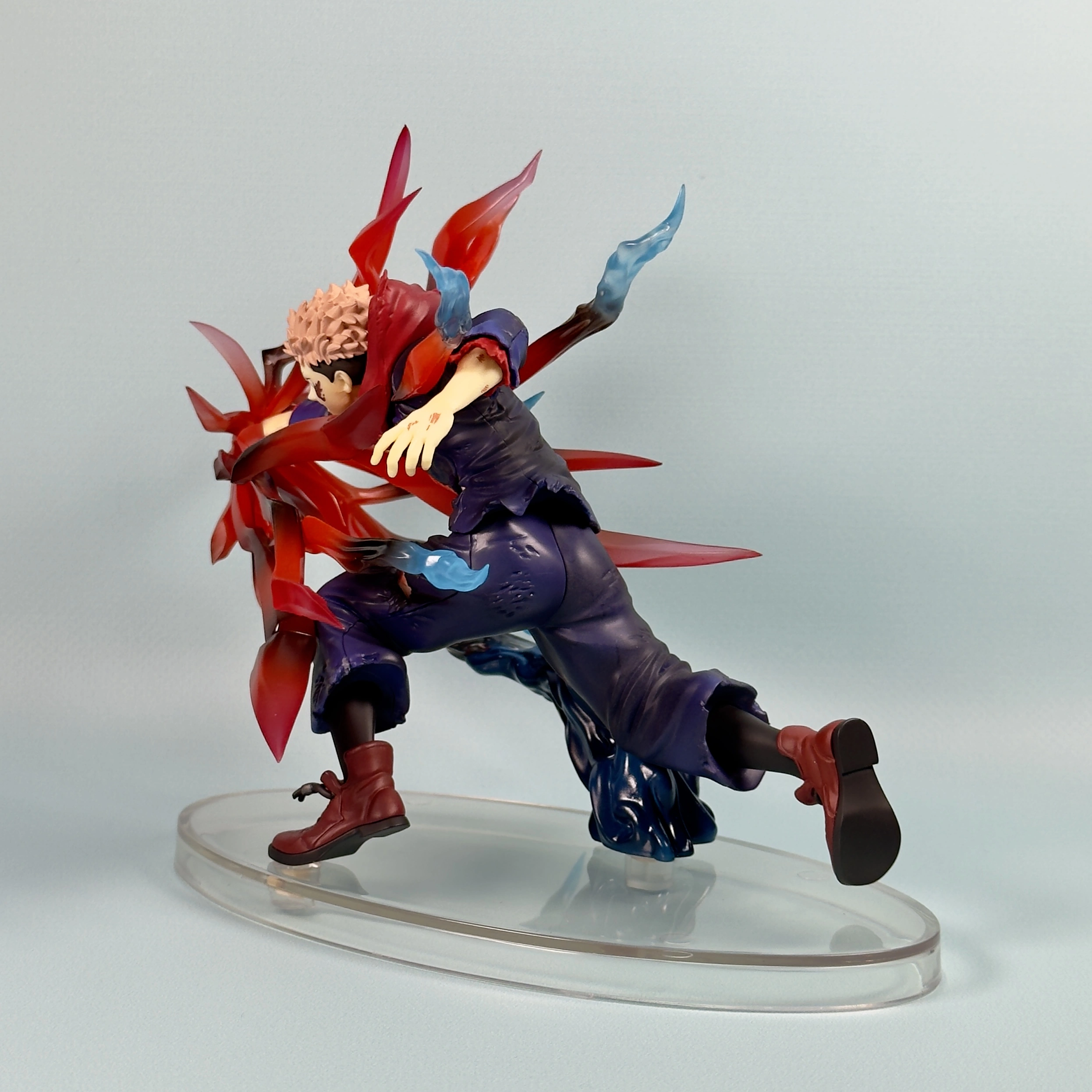 Контраст глибокого темно-синього костюма, червоного капюшона та прозоро-червоних ефектів виглядає максимально динамічно. Сині хвилі енергії позаду додають композиції балансу й об’єму. Прозора підставка майже непомітна, тому здається, що Юджі буквально завис у стрибку ⚡.