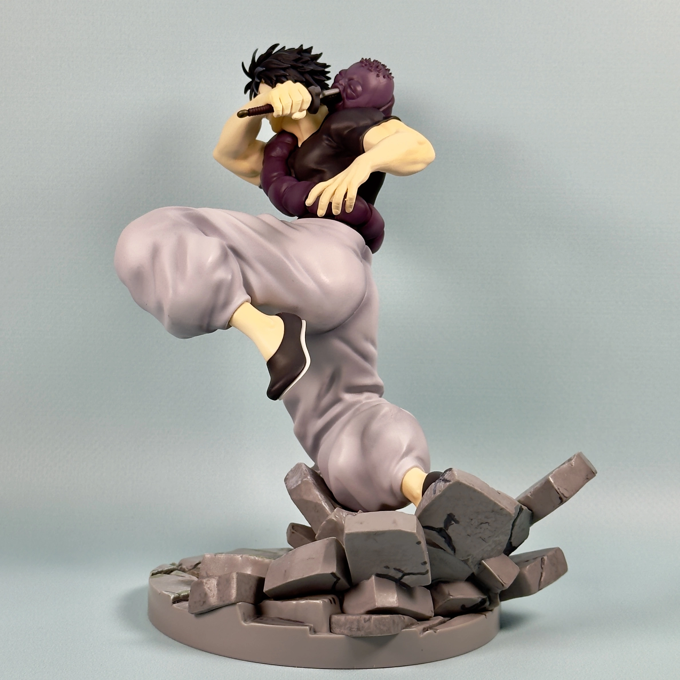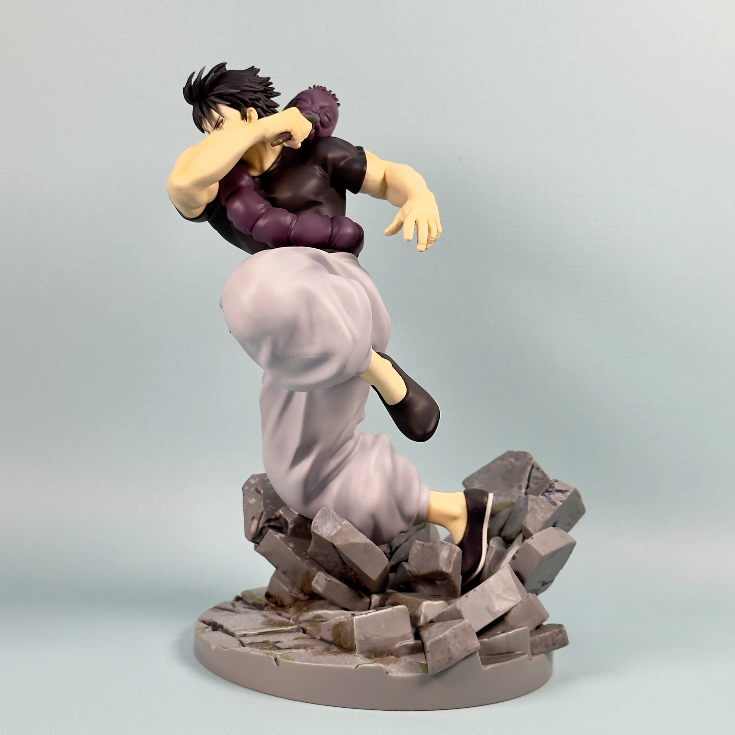 Фірмова деталь — проклятий дух, що обвиває його тіло, додає композиції глибини й характеру. Темна футболка контрастує зі світлими вільними штанами, а масивна база з уламками бетону створює ефект щойно розтрощеної арени бою. Кам’яні блоки під ногами додають динаміки — здається, ніби Тоджі виривається з-під землі просто в атаку 💥!